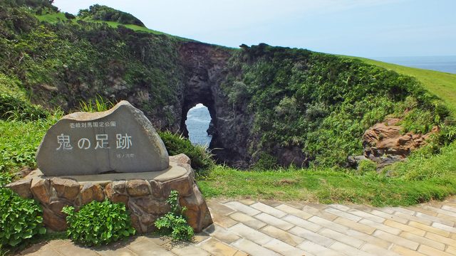 자가타니에 있는 '오니의 발자국'은 오니가시마 전설 속 거대 오니 '데이'가 남긴 오른발 자국입니다. 왼발 자국은 이후 소개할 이키섬의 마키자키 공원에 있습니다.