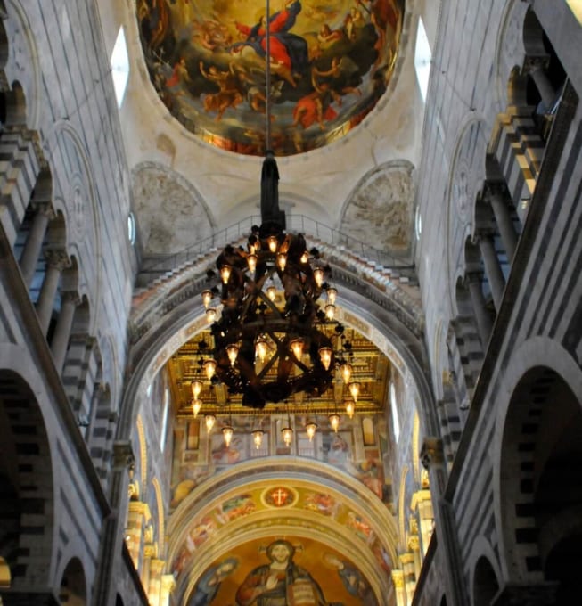 성당 중앙 천정에 매달린 대형 청동 램프는, 피사 출신의 과학자 갈릴레오 갈릴레이(Galileo Galilei)가 ‘진자의 법칙’을 발견하는 계기가 되었다고 전해지는 유명한 전설의 유물입니다. 사실 여부는 확인되지 않았지만, 피사의 역사와 과학적 유산을 상징하는 흥미로운 이야기로 여전히 많은 방문객의 관심을 끌고 있습니다.