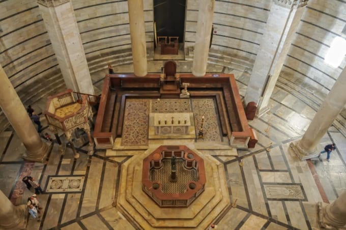 세례당 내부 중앙에는 세례반이 설치되어 있고, 안쪽에는 조각가 니콜라 피사노(Nicola Pisano)가 만든 설교단이 자리하고 있습니다. 이 세례당은 탁월한 음향 효과로도 유명하며, 약 30분마다 안내원이 직접 소리를 울려 시연을 진행합니다. 내부에 울려 퍼지는 맑은 울림을 직접 들어보면 그 정교한 음향 구조에 감탄하게 될 것입니다.
