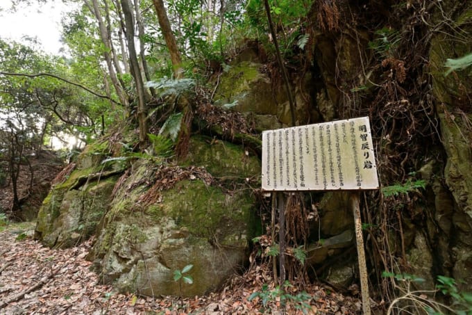 후세에 병풍 바위는 '아케치노 모도리이와(明智の戻り岩)'라고 불리게 되었고, 거대한 바위 앞의 팻말에는 다음과 같은 안내문이 적혀 있습니다.