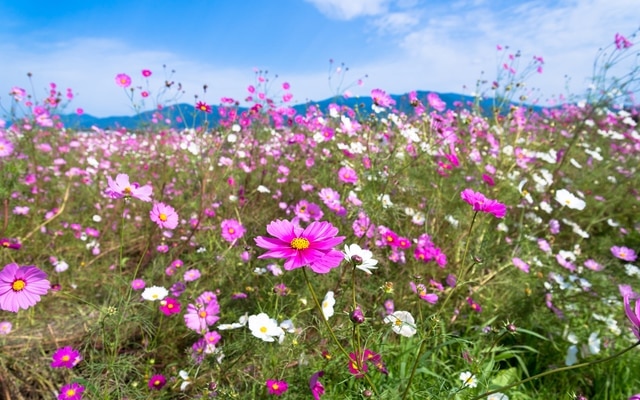 간사이 지역에서도 손꼽히는 규모의 코스모스 정원이 가메오카에 있습니다. 약 5헥타르에 달하는 넓은 부지에 희귀종을 포함한 수십 종의 코스모스가 활짝 피어 있는 모습은 장관입니다. 약 800만 송이의 다채로운 코스모스가 만들어내는 풍경은 잊을 수 없는 가을의 추억이 될 것입니다.