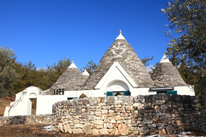 이탈리아 남부 푸글리아(Puglia)주에는 흰색 벽과 원뿔형 지붕을 가진 전통 가옥이 있습니다. 이 가옥들은 선사시대부터 이어져 내려온 형태로, 알베로벨로(Alberobello)에는 이러한 가옥이 밀집해 있어 알베로벨로의 트룰리(Trulli di Alberobello)라는 이름으로 1996년 세계유산에 등록되었습니다.