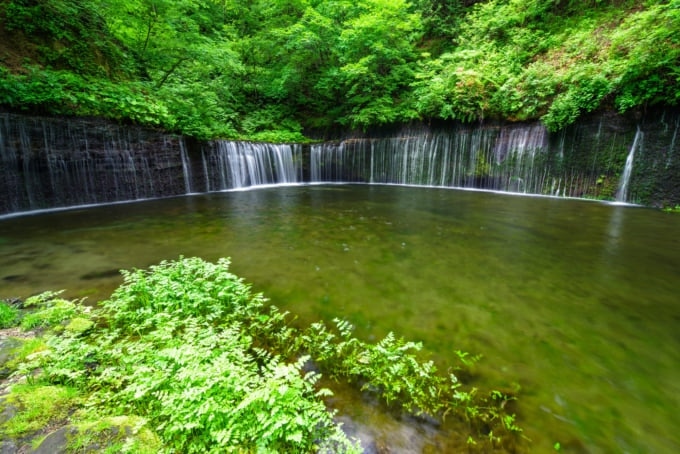 시라이토 폭포는 나가노현 가루이자와에 위치한 자연의 신비를 즐길 수 있는 관광 명소입니다. 지하수가 절벽에서 솟아 흘러내리며 형성된 폭포로, 낙차는 약 3m 정도입니다. 이름 그대로 여러 갈래로 흘러내리는 물줄기가 흰 실타래처럼 떨어지며 물의 커튼을 만들고, 풍부한 마이너스 이온을 느낄 수 있습니다.