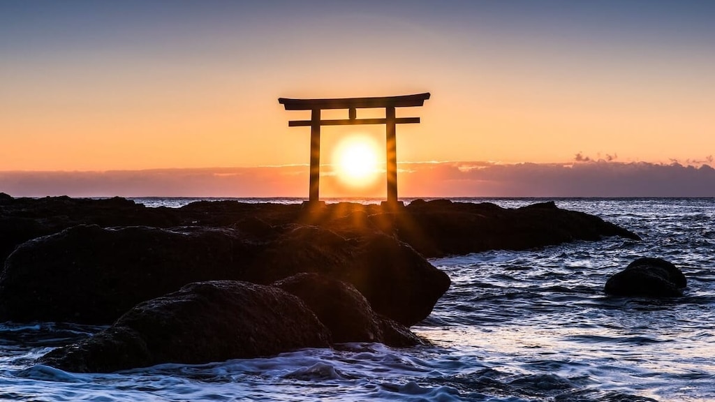오아라이 이소사키 신사의 본전은 현 지정 문화재로 지정되어 있으며, 관동 지역에서도 규모가 큰 대형 토리이로 유명합니다. 태평양을 배경으로 서 있는 붉은 토리이는 새벽녘과 석양, 달빛 아래 등 시간대마다 다른 아름다움을 보여 줍니다. 근처 관광 시설인 ‘오아라이 미술관’에서 내려다보는 토리이 풍경도 인상적입니다.