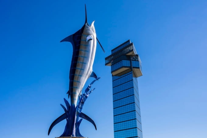 오아라이의 상징이라 불리는 ‘오아라이 마린타워’는 높이 60m의 전망 타워로, 전망실에서 태평양을 한눈에 조망할 수 있습니다. 전면이 하프 미러로 덮인 삼각형 형태의 외관은 파도를 형상화한 디자인으로 세련되고 현대적인 분위기를 자아냅니다.