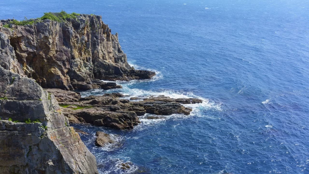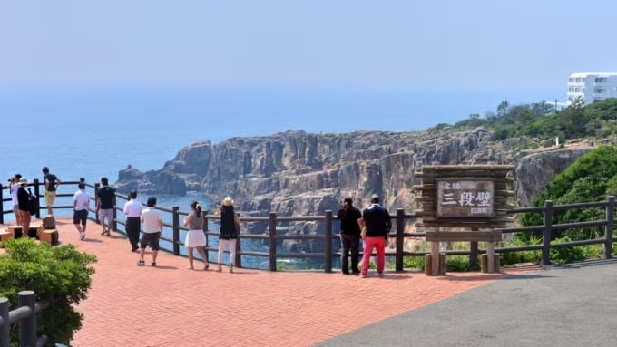 산단베키(三段壁)는 센조지키 남쪽 해안에 우뚝 솟아 있는 높이 약 50m~60m의 거대한 절벽입니다. 남북 약 2km에 걸쳐 이어지는 거대한 암벽과 주상절리가 만들어내는 풍경은 그야말로 압도적입니다. 암벽에 부딪히며 흩날리는 쿠로시오 해류의 거센 파도를 바라보고 있으면, 자연의 힘에 절로 압도될 만큼 장대한 경관이 펼쳐집니다.