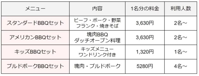 식재료는 코스에 따라 다르며, 기재는 바비큐 그릴에 텐트·의자·테이블, 작업대와 조리 기구, 접시·젓가락·물수건이 포함되어 있습니다.