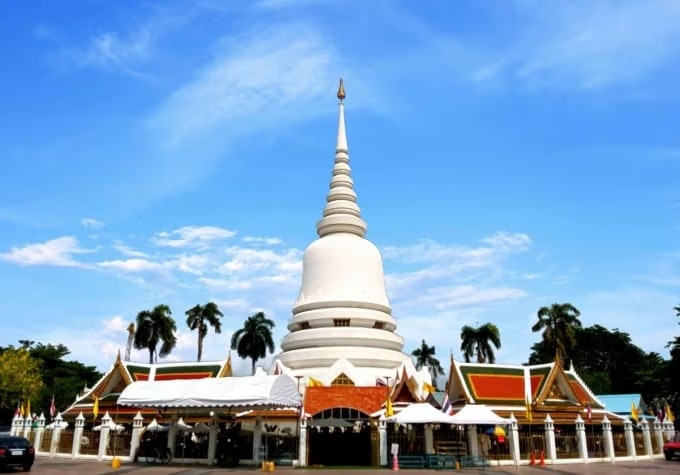돈므앙공항에서 차로 약 15분 거리에 있는 와트 프라 시 마하타트 워라 마하 위한(Wat Phra Si Mahathat)은 하얀 불사리탑이 인상적인 불교 사원입니다.