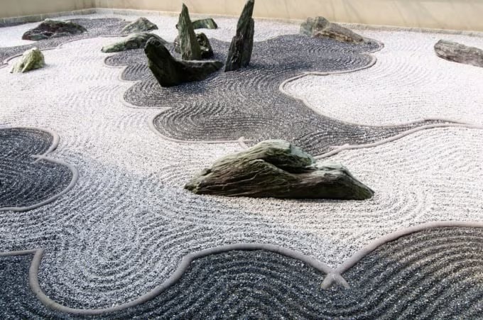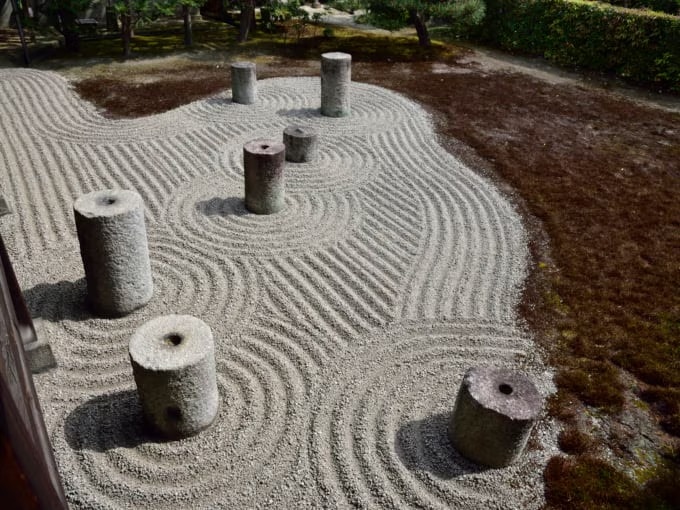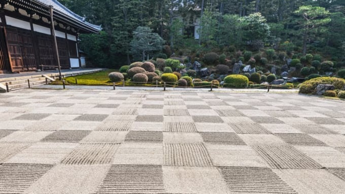 흰 모래로 그려낸 체크 패턴의 사문이 아름다운, 고요한 분위기의 공간입니다.