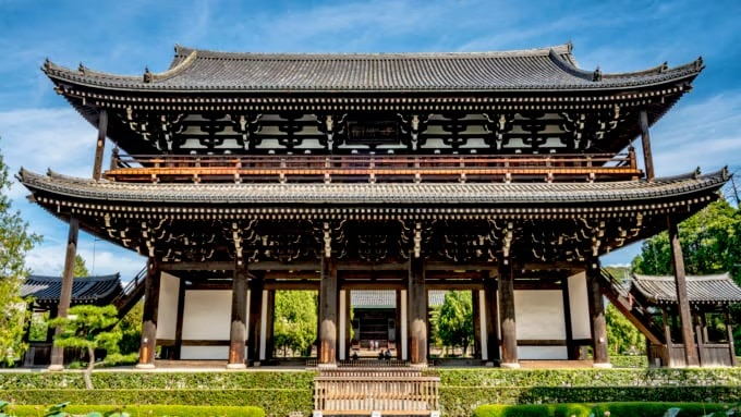 도후쿠지의 국보 ‘삼문’은 무로마치 막부 4대 쇼군 아시카가 요시모치가 1425년에 재건한 건물로, 현존하는 가장 오래된 최대 규모의 삼문입니다. 삼문 상부에 걸린 ‘묘운각’ 편액은 요시모치의 친필이며 내부에는 화려한 극채화가 그려져 있습니다.