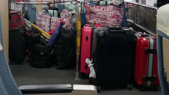 승선 후에는 캐리어를 짐 보관 공간에 두고 지정된 좌석에 착석합니다.