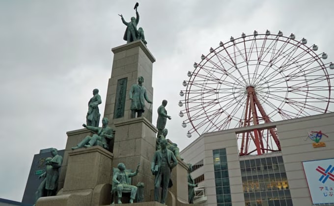 역 건물에는 대관람차 ‘아뮤란(アミュラン)’과 쇼핑몰 ‘아뮤플라자(アミュプラザ)’가 있어 식사와 쇼핑을 즐길 수 있는 매장이 다양하게 입점해 있습니다. 또한 사쓰마 지역의 역사적 배경을 느낄 수 있는 유신지사들의 기념 조형물도 볼 수 있습니다.