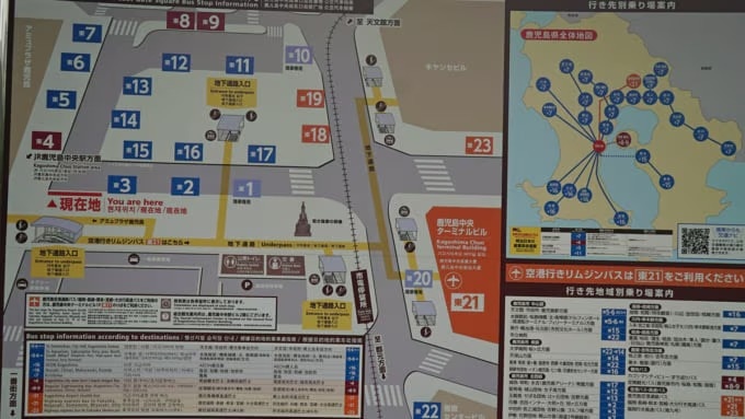 가고시마공항과 가고시마중앙역을 연결하는 에어포트 셔틀의 승하차 지점은 지도 오른쪽 아래에 주황색으로 표시된 ‘동21’ 승강장입니다.