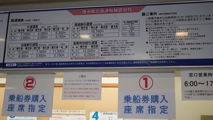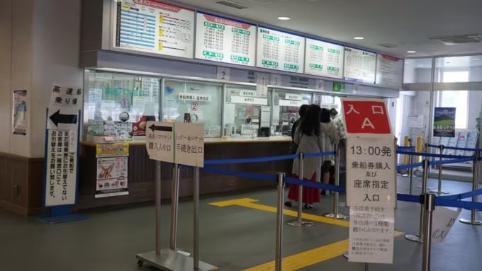 가고시마 본항 남부두에 도착하면 티켓 매표소 창구에서 승선 수속을 진행합니다. 좌석 지정은 출항 1시간 전부터 가능합니다. 창구에서 예약 번호를 전달한 뒤 좌석을 지정하고 승선권을 수령합니다.