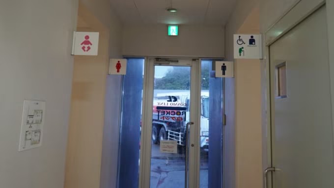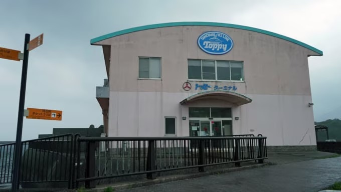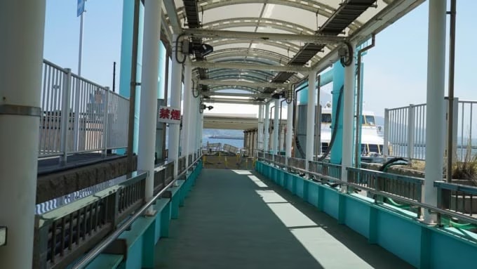 미야노우라항 고속선 터미널은 파란색과 분홍색 두 동으로 구성되어 있습니다. 바다 쪽에서 바라보았을 때 승선구 왼편에 있는 파란색 건물로 먼저 이동합니다.