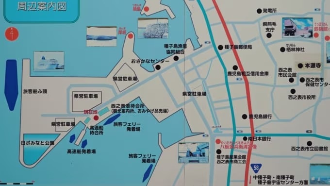 다네시마의 고속선 터미널은 섬 북서부에 위치한 니시노오모테항에 있습니다.