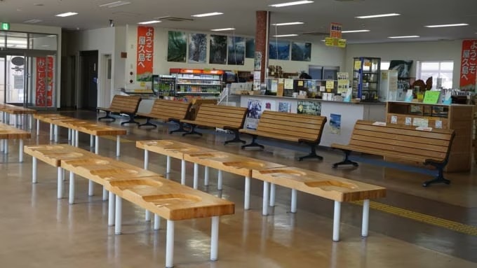분홍색 건물은 승선구 정면에 있으며, 야쿠시마답게 삼나무를 많이 사용한 깔끔한 대합실입니다.
