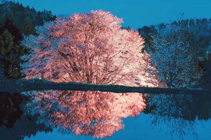 군마현의 천연기념물로 지정되어 있으며, 만개 시기에는 라이트업도 진행됩니다. 눈앞에 펼쳐진 논에 비치는 벚꽃의 모습이 특히 인상적이어서, 낮과는 또 다른 아름다움을 감상하실 수 있습니다.