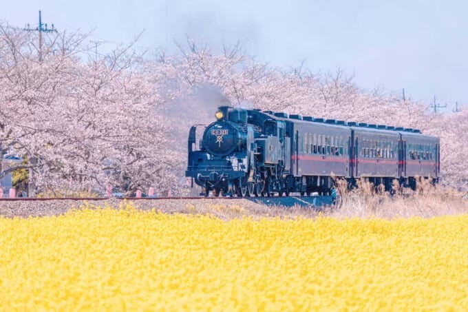 도치기현을 달리는 모카 철도는 증기기관차 SL이 실제로 운행되는, 전국적으로도 보기 드문 노선입니다. 특히 모카역과 니시타다이역 사이 구간에서는 약 1킬로미터에 걸쳐 벚꽃 가로수와 유채꽃밭이 펼쳐져, SL과 벚꽃, 유채꽃이 어우러진 아름다운 풍경을 감상할 수 있습니다.