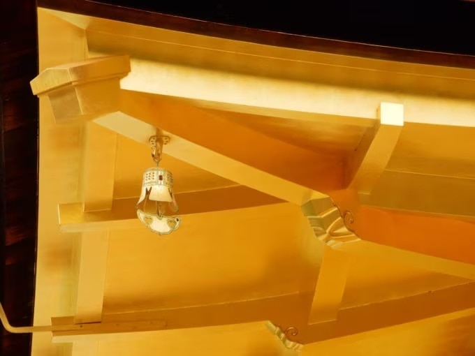 3층 ‘쿠쿄초’는 중국풍 선종 불전 양식으로, 외벽뿐 아니라 내부 천장과 벽에도 금박이 사용되었습니다. 바닥은 흑칠로 마감되어 있으며 중앙에는 불사리가 안치되어 있습니다.