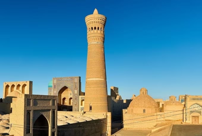 1127년에 건설된 칼란 미나레트는 높이 약 48m로, 당시 이슬람 건축 기술의 수준을 잘 보여줍니다. 구름 한 점 없는 푸른 하늘과 어우러지는 모래빛 미나레트의 모습은 매우 인상적입니다. 정상에 오르면 부하라 시내 전경을 한눈에 조망할 수 있어 사진 촬영 명소로도 유명합니다.
