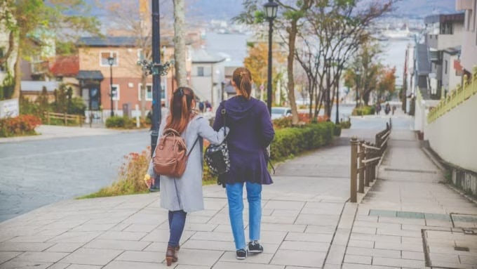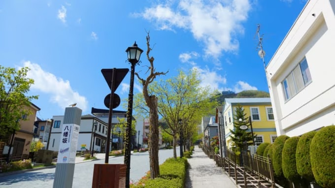 이번에는 실제로 하치만자카를 내려가 보겠습니다. 눈앞에는 하코다테만과 맞은편의 거리 풍경, 산들이 펼쳐지고, 곧게 이어진 길은 시야가 탁 트여 상쾌한 기분을 느끼게 합니다. 언덕 위에서 바라보는 풍경은 하치만자카를 대표하는 전형적인 장면입니다.