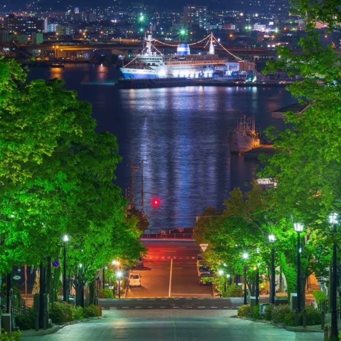 조명이 비춘 돌바닥 너머로 보이는 바다, 옛 세이칸 연락선 ‘마슈마루’, 그리고 맞은편 도시의 불빛. 하코다테산에서 내려다보는 화려한 야경과는 또 다른, 절제된 아름다움이 마음을 사로잡습니다. 하치만자카의 밤 풍경은 언덕이 많은 하코다테에서도 특히 손꼽힙니다.