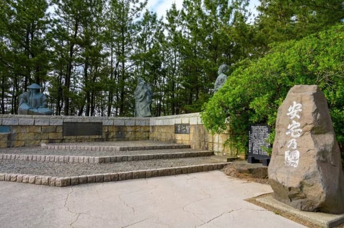문지 3년에 세워진 관문 시비와 함께, 받침돌에 ‘지・인・용’이라 새겨진 요시쓰네, 벤케이, 도가시의 동상도 세워져 있습니다.