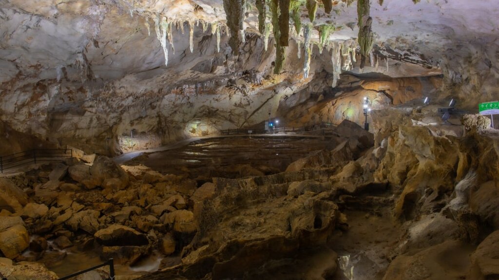 넓은 동굴 내부에는 다양한 명소가 자리하고 있습니다. 폭 15m, 길이 100m에 이르는 지하 강인 ‘나가부치’, 길이 약 15m의 석주 형태를 띠는 ‘황금기둥’, 수많은 종유석이 천장에서 늘어져 있는 ‘사미다레 고텐’ 등 볼거리가 풍부합니다. 자연이 만들어낸 신비로운 동굴 속에서, 또 다른 자연의 조형미를 감상할 수 있습니다.