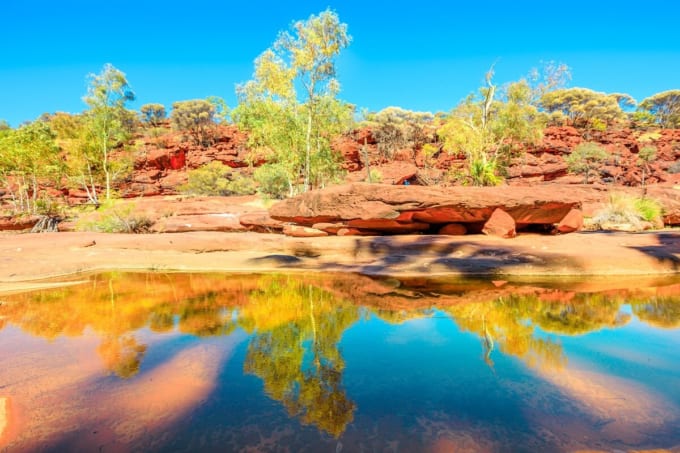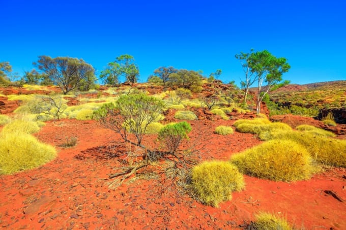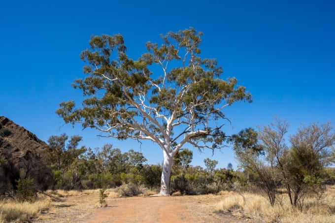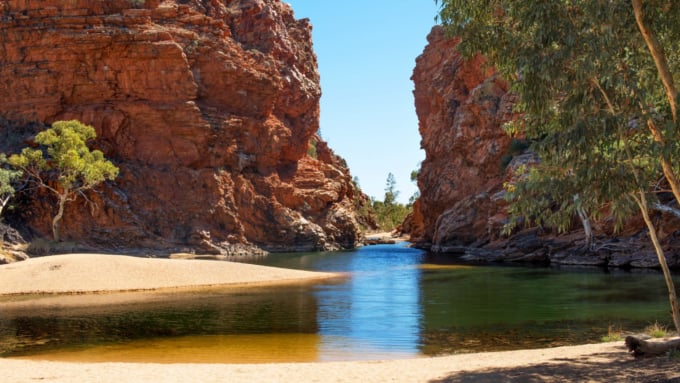 중앙 호주에서는 산맥에서 흘러나오는 물 덕분에 바위가 많은 땅에서도 숲을 볼 수 있습니다.
