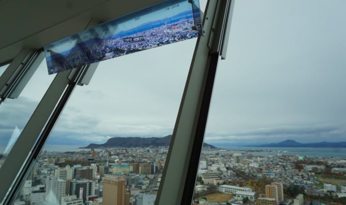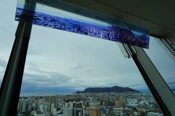 ・유리 상단에 산·바다·건물 등의 명칭이 표기되어 있어 하코다테 주변 지형 이해에 도움
