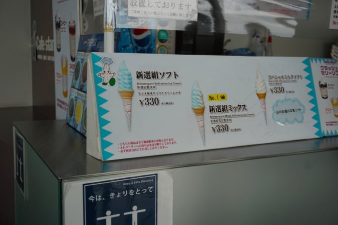가장 인기가 많은 메뉴는 ‘신센구미 믹스(新選組ミックス)’로, 연한 파란색의 라무네 풍미 ‘신센구미 소프트’와 스페셜 밀크 소프트를 함께 맛볼 수 있습니다.