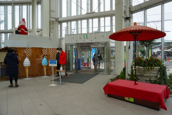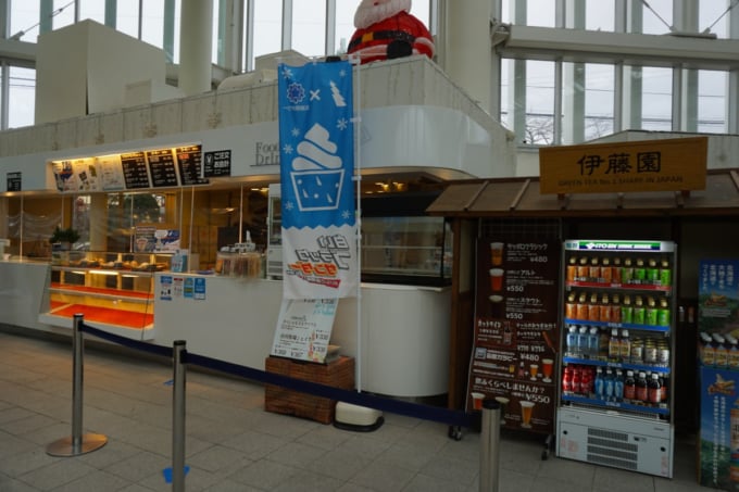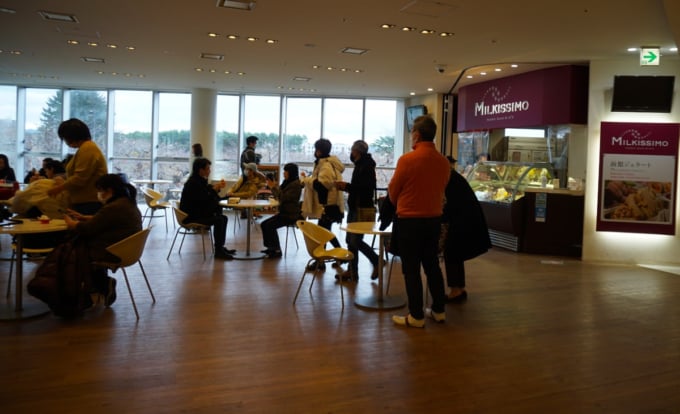 MILKISSIMO 고료카쿠 타워점은 2층에서 1층 아트리움으로 내려가는 계단 바로 앞에 있습니다. 구매하신 젤라토는 매장 앞 공간에 마련된 테이블에서 드실 수 있습니다.