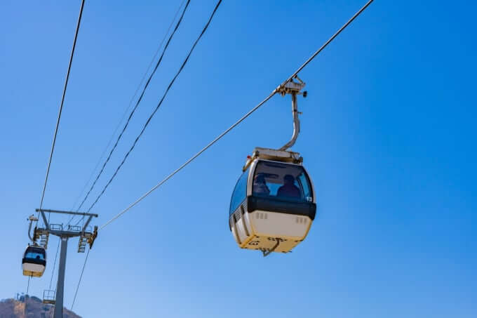 산기슭에 도착하면 로프웨이를 타고 정상으로 이동합니다. 소요 시간은 약 7분으로, 올라가는 동안 시시각각 변하는 경치를 즐길 수 있습니다.