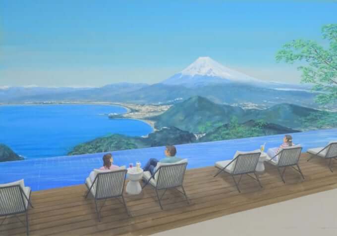 아오테라스에는 세 개의 푸른 수반이 새롭게 설치되어, ‘후지산·스루가만·하늘’이 물 위에 비치는 장면을 감상할 수 있습니다. 또한 절경을 바라보며 쉴 수 있는 ‘더 워터 라운지(무료)’도 함께 마련되어 있습니다.