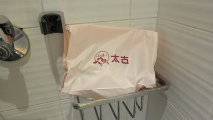 샴푸와 바디워시는 안내소에서 세트로 판매하며, 타이코 로고가 들어간 파우치에 담겨 있어 여행 기념품으로도 좋습니다.