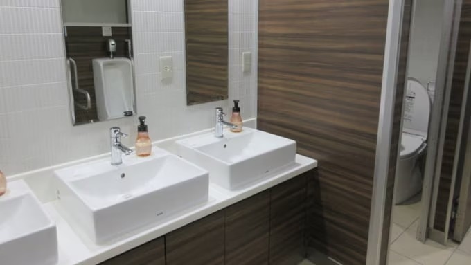세면대는 화이트 톤으로 통일되어 깔끔한 인상을 줍니다.