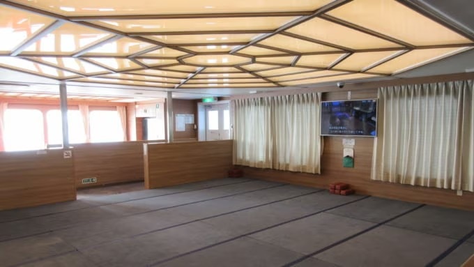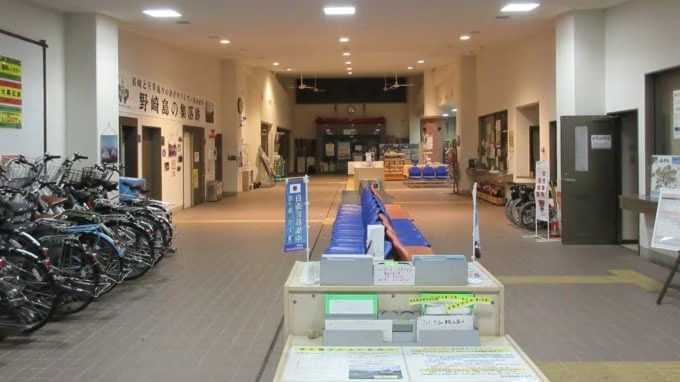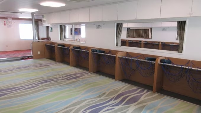 예약 없이 이용 가능하며, 베개와 담요도 준비되어 있습니다. 건물 안에는 로커와 자판기도 있어 불편함이 없습니다. 참고로 사진은 다음 기항지인 오지카항의 휴게실입니다.