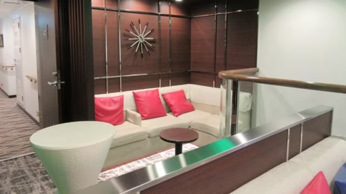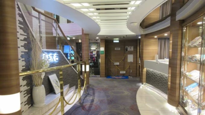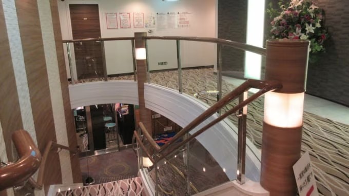 안내 데스크 앞의 고급 여객선 분위기의 계단을 따라 2층으로 올라가면 지정 객실 구역이 이어집니다.