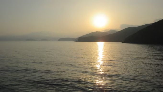 다음 기항지인 아오카타항에 도착할 무렵, 고토 열도에도 서서히 아침이 밝아옵니다. 아오카타항이 위치한 나카도리섬은 고토 열도에서 두 번째로 큰 섬입니다. 항구 북쪽의 후나자키는 동백기름을 넣는 것이 특징인 고토 우동의 발상지로 알려져 있습니다.