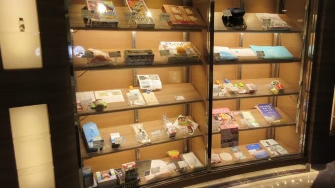 안내 데스크 오른쪽에는 기념품과 오리지널 굿즈 진열대가 있습니다.