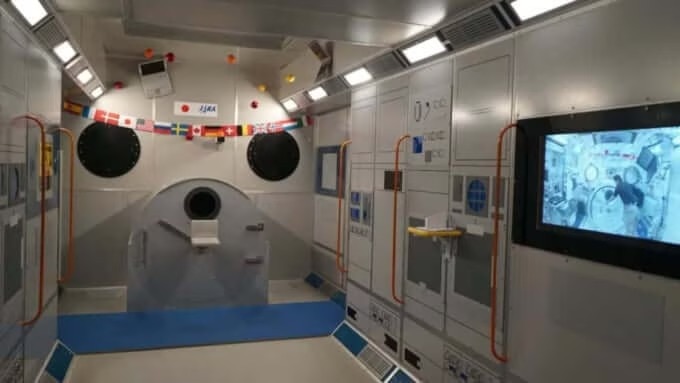 국제우주정거장 일본 실험동 ‘기보’의 실물 크기 모형에서는 무중력 체험 사진을 촬영할 수 있으며,