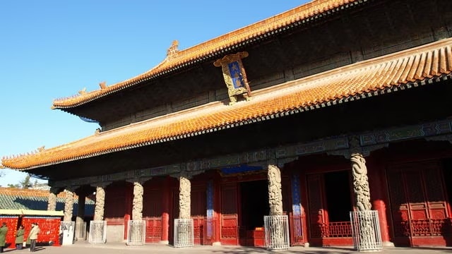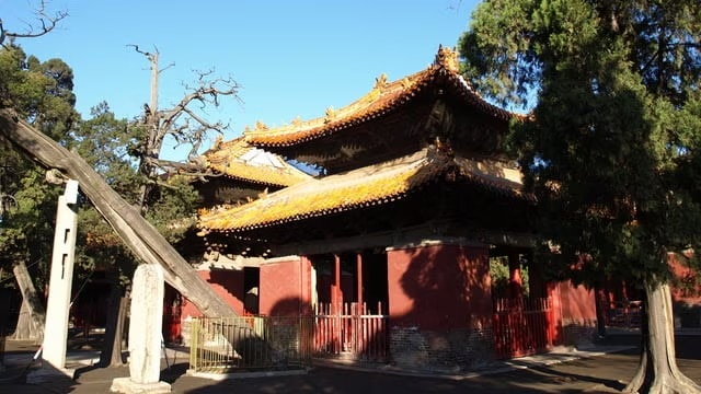 공묘 내부에서는 공자의 유품도 관람할 수 있습니다. 입구에 세워진 높이 5.6미터의 석조 금성옥진방에는 조천후라 불리는 일각수 조각이 새겨져 있어 인상적입니다. 공묘의 중심에는 폭 54미터, 깊이 34미터, 높이 32미터에 이르는 거대한 대성전이 자리하고 있습니다. 특히 기둥 장식이 매우 아름다워, 황제가 행차할 때 자금성과 비교되어 질투심을 유발하지 않도록 천으로 가려두었다는 일화가 전해질 정도입니다. 대성전 앞뜰에 있는 행단은 공자가 제자들에게 강론을 하던 장소로 알려져 있습니다.