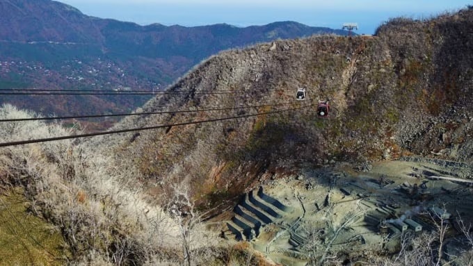 오와쿠다니역에서 바라본 풍경입니다. 이 구간에서는 단풍을 거의 볼 수 없었습니다. 화산 활동으로 형성된 황량한 지형이 펼쳐져 있어, 붉게 물든 나무보다는 하얀 수증기와 바위 지대의 독특한 풍경이 인상적이었습니다.