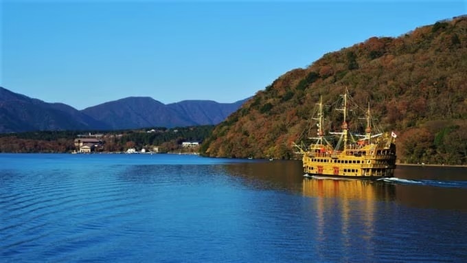 도겐다이항을 출항하자마자 보이는 구간에서는 단풍을 거의 볼 수 없었습니다. 대신 해적선 「퀸 아시노코(クイーン芦ノ湖)」를 볼 수 있었습니다.