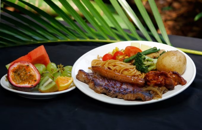 소시지, 설로인 스테이크, 볶음 채소, 치즈 플래터, 수프와 빵, 샐러드, 밥, 그리고 과일 플래터까지 다양하게 구성되어 있어 한국인 여행객도 부담 없이 즐기실 수 있습니다.