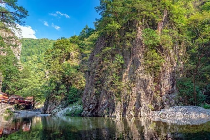 산단쿄에서 가장 아름다운 명소 중 하나로 알려진 곳이 바로 ‘구로부치 (黒淵)’입니다. 깎아지른 절벽과 짙은 녹색의 소가 어우러져 신비로운 분위기를 자아냅니다. 가장 깊은 곳은 약 5m이며 물이 검게 보이는 것으로도 유명합니다.
