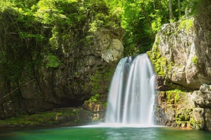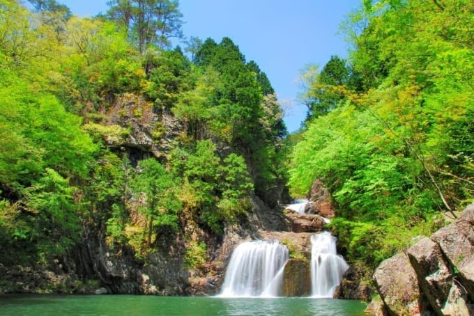 ‘산단타키 (三段滝)’는 산단쿄라는 이름의 유래가 된 대표적인 명소입니다. 관광 포스터에도 자주 등장하는 유명한 장소입니다. 푸른 숲 속에서 상단・중단・하단 세 단계로 이루어진 약 30m 높이의 폭포가 깊이 약 10m의 소로 떨어지는 장관을 볼 수 있습니다. 자연이 만들어 낸 아름다운 풍경은 마치 한 폭의 그림과 같은 인상을 줍니다.