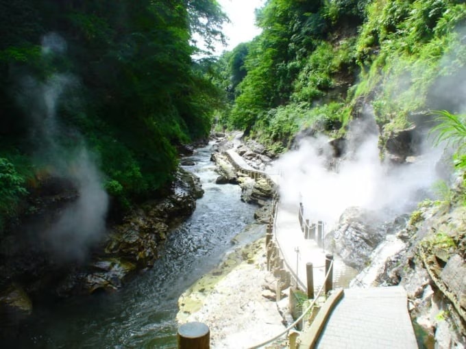 미나세강의 침식으로 형성된 코야스 협곡 대분탕은 비교적 덜 알려진 숨은 명소입니다. 산책로를 따라 걸으며 뜨거운 온천수와 수증기가 분출되는 장관을 가까이에서 감상할 수 있습니다. 봄과 여름에는 신록, 가을에는 단풍과 함께 어우러진 풍경을 즐길 수 있어 계절마다 다른 매력을 느낄 수 있습니다.